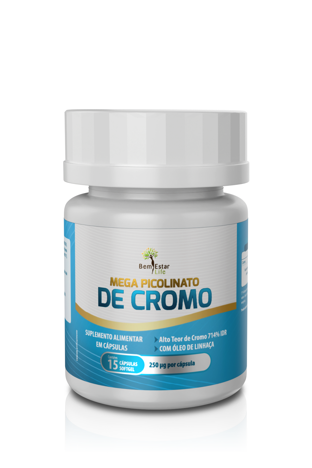 O Mega Picolinato de Cromo da *Bem Estar Life* contém 250 microgramas de cromo e é veiculado ao óleo de linhaça.