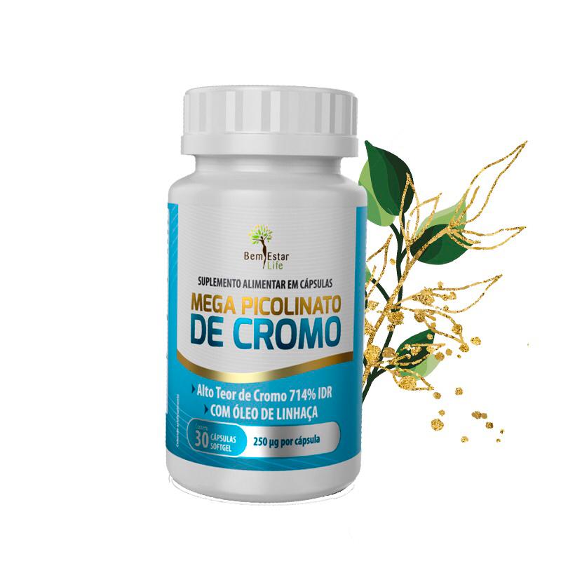 O Mega Picolinato de Cromo da *Bem Estar Life* contém 250 microgramas de cromo e é veiculado ao óleo de linhaça.